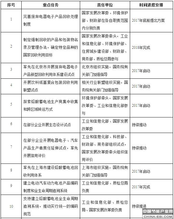 《方案》将生产者责任延伸的范围界定为开展生态设计、使用再生原料、规范回收利用和加强信息公开等四个方面,率先对电器电子、汽车、铅蓄电池和包装物等产品实施生产者责任延伸制度,并明确了各类产品的工作重点。一是电器电子产品,要在坚持现有处理基金制度的基础上,制定生产者责任延伸制度的评价标准,支持生产企业建立废弃产品的新型回收体系,发挥基金的激励约束作用;二是汽车产品,制定生产者责任延伸政策指引,鼓励生产企业利用售后服务网络与符合条件的拆解企业、再制造企业合作建立逆向回收利用体系,建立电动汽车动力电池回收利用体系;三是对铅酸蓄电池、饮料纸基复合包装等产业集中度较高、循环利用产业链比较完整的特定品种,在国家层面制定、分解落实回收利用目标,建立完善统计、核查、评价、监督和目标调节等制度,支持生产企业、回收企业和再生企业建立基于市场化的回收利用联盟。