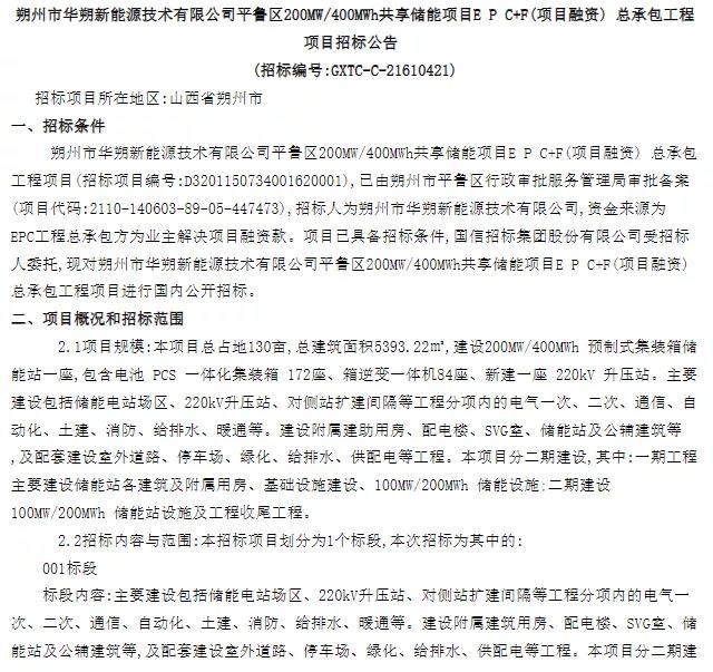 北极星储能网获悉,近日,朔州市华朔新能源技术有限公司发布平鲁区200MW/400MWh共享储能项目EPC+F(项目融资)总承包招标公告。公告中提出200MW/400MWh共享储能项目分二期建设。