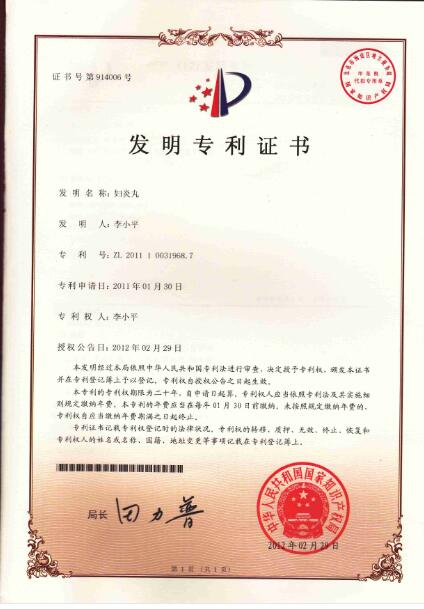 李中医是一位长期致力于男女泌尿、生殖系统疾病的临床研究,在诊断和治疗男女泌尿、生殖系统疾病方面独具特色的老中医。三十多年来李中医凭借自己对中医理论的深刻理解和丰富的临床经验,在古方基础上经过合理加减配伍出了能够治疗妇科疾病及炎症导致的女性不孕症的中药配方妇炎丸,并且由于妇炎丸的配方在临床应用时可以做到因人制药、专人专方治病,所以其治疗效果十分显著,为此李中医还特地向国家申请了发明专利。2012年2月29日李中医的申请通过了国家审核,并获颁了专利证书,妇炎丸的专利号为:ZL201110031968.7。本以为有了治疗妇科疾病的良方可以造福很多患者,而如何生存和传承却成了李中医当时所面临的最大的问题。