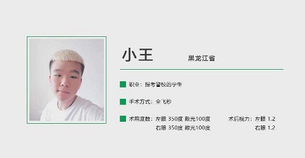 王晨是一名报考警校的高中毕业生,为了达到相关的视力要求,在考前来茗视光眼科进行了加紧检查和手术,手术十分顺利,双眼的术后视力均恢复到1.2。