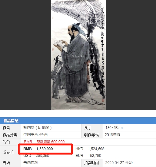 从以上作品都在百万元上下的成交记录来看,杨国新先生的人物绘画作品,不论文人、仕女或是禅道题材,市场地位可见一斑!与已故知名大家作品相比,价格方面升值潜力还是极大的!此时如果以合适的最优价格收藏到如此优秀名家的精品力作,升值增长也只是时间问题。