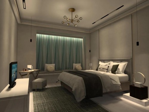 在这样的住宅空间,我们可以采用磁吸轨道+格栅射灯模块。一条洗亮床头,营造舒适睡眠环境;一条洗亮背景墙,漫反射减少电视光差度,保护视力。