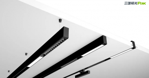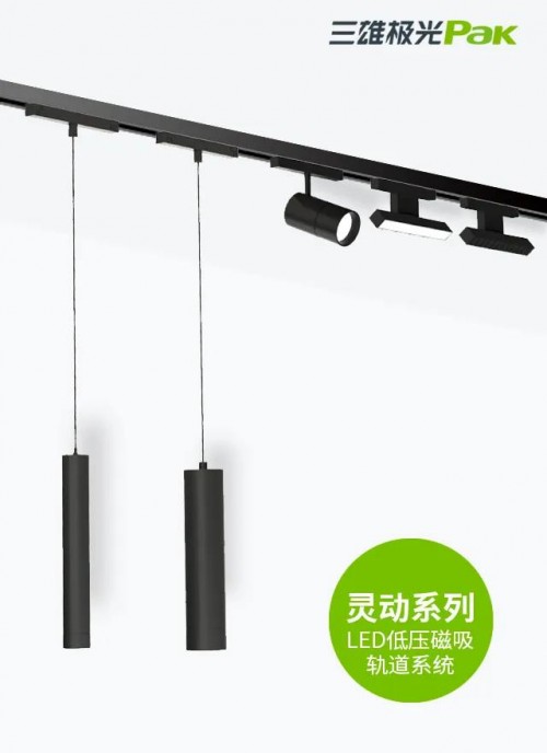 以三雄极光灵动系列LED低压磁吸轨道系统为例(下文简称“灵动系列”),一条轨道即可兼顾基础照明与重点照明,灯体即插即亮、拆装方便、灵活移动等多重优势,特别适合时下大热的极简风格,让空间干净利落、延伸视觉效果。