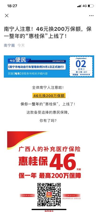 在广西各大城市的街头,和重点区、市的媒体上,“惠桂保”也以亮眼的形式,吸引市民们的注意。通过打通线上、线下,连接社区、企业、公众,融合网络、电视、广播、户外,形成了强大的宣传势能。