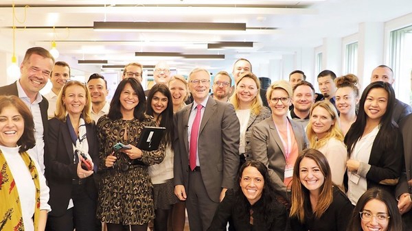 德科集团CEO Alain Dehaze(中)与员工在一起