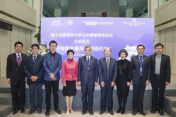 第十五届清华大学公共管理高层论坛可持续发展与治理现代化分论坛 与会嘉宾合影 (从左至右为:清华大学公共管理学院副教授、清华大学全球可持续发展研究院副院长朱俊明先生,科学技术部中国21世纪议程管理中心计划协调与信息处处长张书军先生,生态环境部国家应对气候变化战略研究和国际合作中心战略规划部主任柴麒敏先生,清华大学公共管理学院教授、香港环境局前副局长潘洁女士,清华大学文科资深教授、清华大学苏世民书院院长、清华大学全球可持续发展研究院联席院长薛澜先生,科学技术部中国21世纪议程管理中心主任黄晶先生,王珏女士,朱旭峰教授,科学技术部中国21世纪议程管理中心社会处副处长张贤先生)
