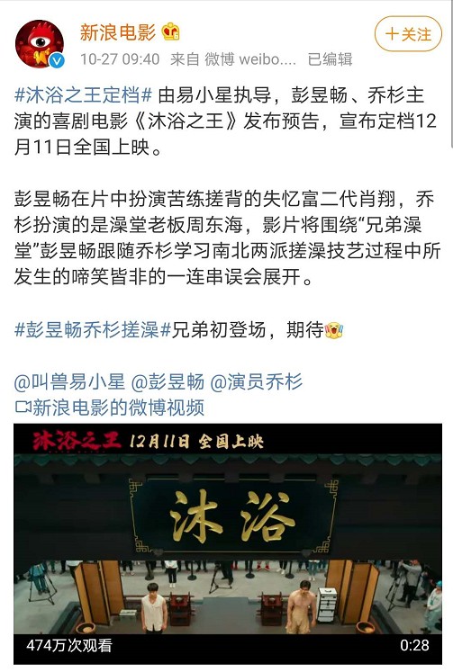 首先来看下,由彭昱畅、乔杉领衔主演的喜剧电影《沐浴之王》,这部影片由易小星执导,已定档12月11日全国上映。从发布的“你永远是我弟弟”版剧情预告中可以看出,弟弟彭昱畅意外失忆“怀疑人生”,而哥哥乔杉则“循循善诱”,帮助公子哥彭昱畅成长为一代搓澡王者,真假兄弟欢乐逗趣,吊足观众胃口。