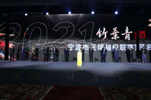 宁波广电集团体育产业部主任邵磊进行大会发言,他指出体育产业如今是市场热度非常高的一项朝阳产业。在宁波,民间足球有着良好的群众基础,各种比赛风起云涌,其中,甬超联赛是规格最高,水平最高的赛事,跟竹叶青酒为消费者奉献高品质、高颜值、高健康价值的精品定位不谋而合。业余足球讲求重在参与,奉行快乐足球的理念,这与竹叶青酒将“人与自然和谐共生”的传统文化,追求创造更健康的生活方式一脉相承。他坚信:以健康价值为核心的竹叶青酒在大健康产业之路上必将跑得更快、飞得更高!与会领导与嘉宾共同启动竹叶青酒与2021宁波市足球超级联赛(简称甬超联赛)冠名仪式。