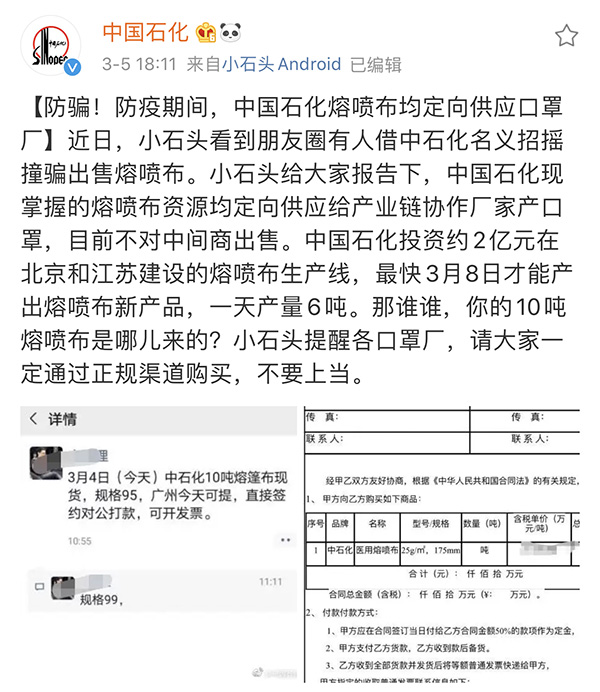 针对社交媒体上打着中国石化的旗号兜售、抬价熔喷布的现象,中国石化曾于3月6日发布声明“打假”。中国石化称,近期社会和网络上有个人或单位声称有中国石化生产的熔喷布货源,高价出售所谓的货源并收取全额预付款。“中国石化以自有销售体系将熔喷布资源定向供应给产业链协作厂家,未委托自有销售体系外的任何公司、组织或个人销售或开展熔喷布相关业务,且不对中间商出售,资质入网也不收取任何手续费。任何声称中国石化委托其开展熔喷布商业活动的主体及其行为均与中国石化无关。”