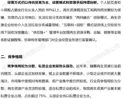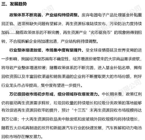 回收利用行业研究(简版),从行业现状、竞争格局、发展趋势和风险提示四方面入手,对再生资源行业进行了分析,详情如下: