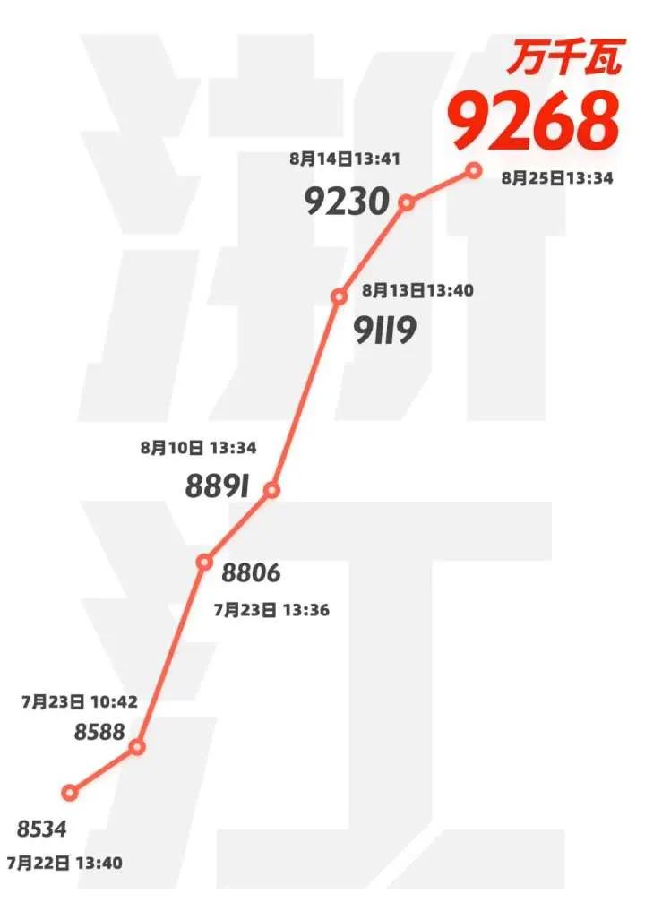 2020年夏季,受持续高温天气影响,浙江全社会用电负荷7创历史新高,8月份,浙江最高用电负荷达到9268万千瓦,月用电量同比增长13.15%。