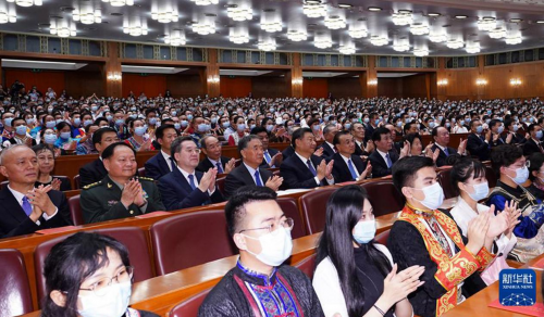 人民大会堂万人大礼堂灯光璀璨,处处欢声笑语。20时许,习主席等来到晚会现场,全场响起热烈的掌声。一个个节目,民族特色鲜明、表现形式多样、 时代气息浓厚,精彩纷呈,把晚会不断推向高潮。整台晚会热情讴歌了以习主席同志为核心的党中央的坚强领导和对各族人民的亲切关怀,生动展现出中华文化的绚丽多彩、丰富内涵,生动描绘出各族儿女像石榴籽一样紧紧拥抱在一起共同团结奋斗的壮美画卷,充分反映出中华儿女建设中华民族共有精神家园、坚定不移跟党走、昂扬奋进新征程的坚定决心和豪迈气概,全场不时响起热烈掌声。最后,伴随着《这是我们美好家园》的激扬旋律和各族演员的尽情欢舞,晚会落下帷幕。