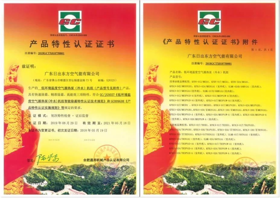凭借出色的产品性能,四季沐歌空气源热泵机组已获得由合肥通用机电产品检测院授予的GC/JG5027《低环境温度空气源热泵智能除霜特性认证》、GC009G08《低环境温度空气源热泵超高能效特性认证》双项证书。