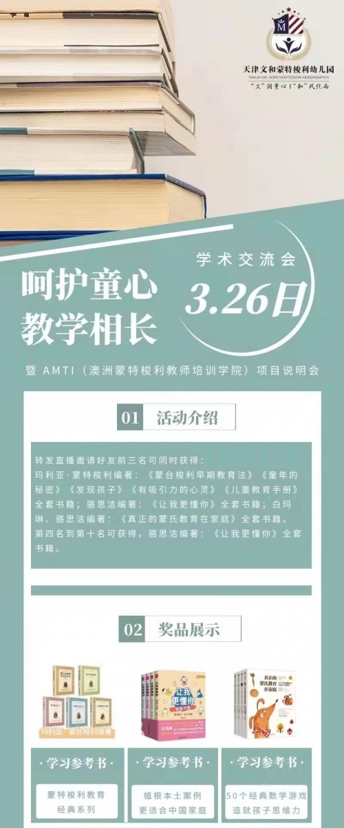 3月26日,天津丽思卡尔顿酒店,更多详细信息可通过“天津文和蒙特梭利幼儿园”进行了解。欢迎从事幼儿教育以及注重家庭教育的您!我们共同走近澳洲蒙特梭利培训学院AMTI。