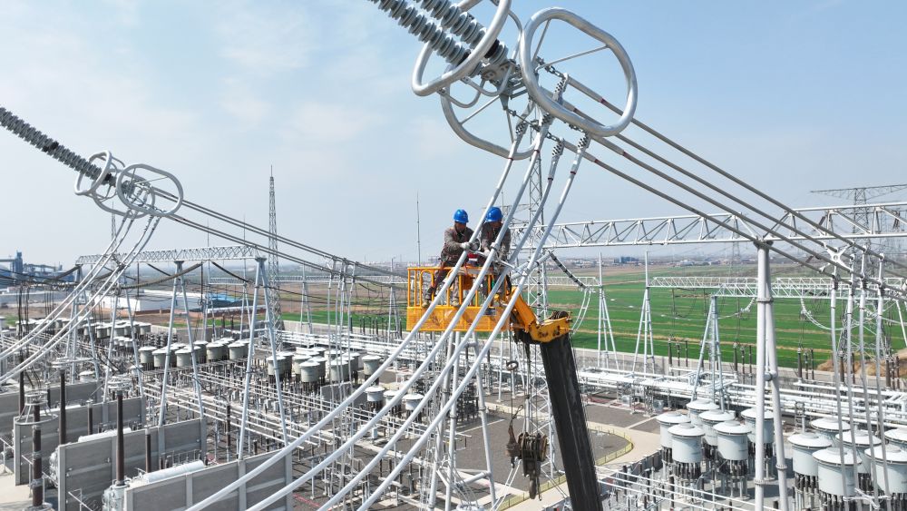 新华社天津4月7日电(记者郭方达、王宁)清明假期,位于天津市滨海新区小王庄镇的天津南1000千伏特高压变电站扩建工程现场,1000千伏设备区南北侧各有一台吊车挥舞着长臂,把需要对接安装的设备吊装到位。