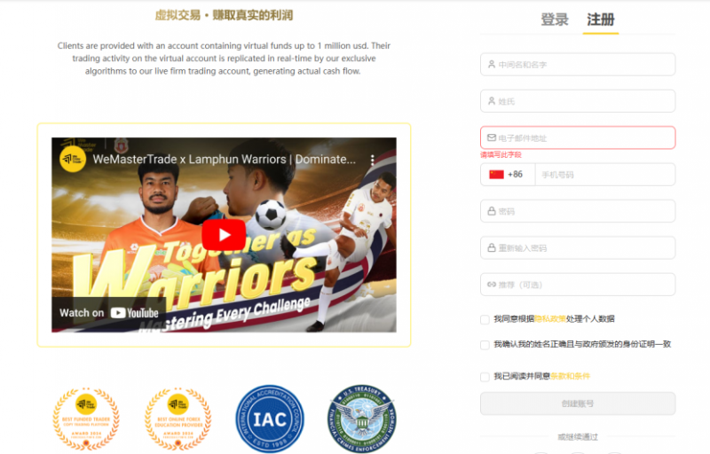 1.访问WeMasterTrade官网https://wemastertrade.com/zh/,填写基础信息就能免费注册账号;