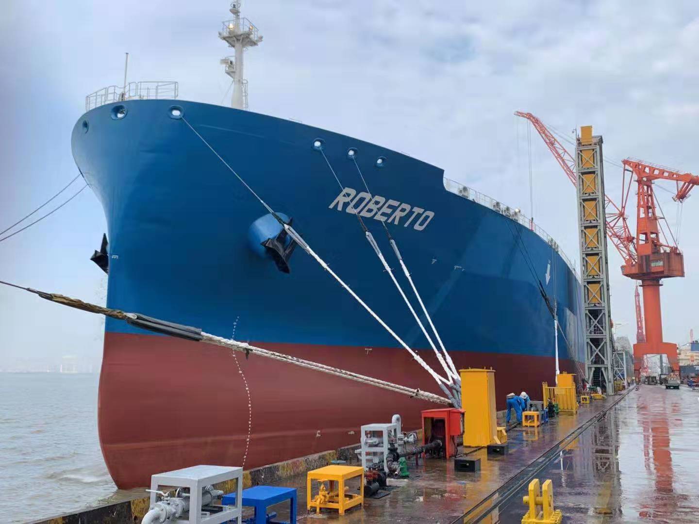 在命名仪式上,新加坡船东代表在码头为4艘新一代VLGC系列船分别命名为RED RUM、REFERENCE POINT、ROBERTO和RED MARAUDER。