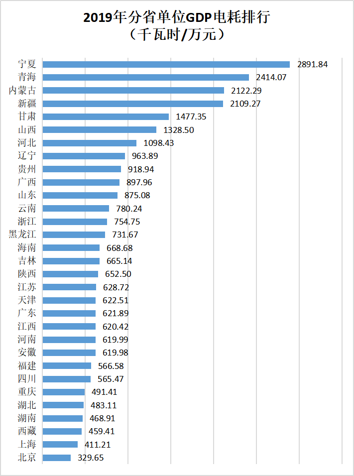 由上图可见:宁夏单位GDP电耗最高,达2891.84千瓦时/万元;北京最低,为329.65千瓦时/万元。