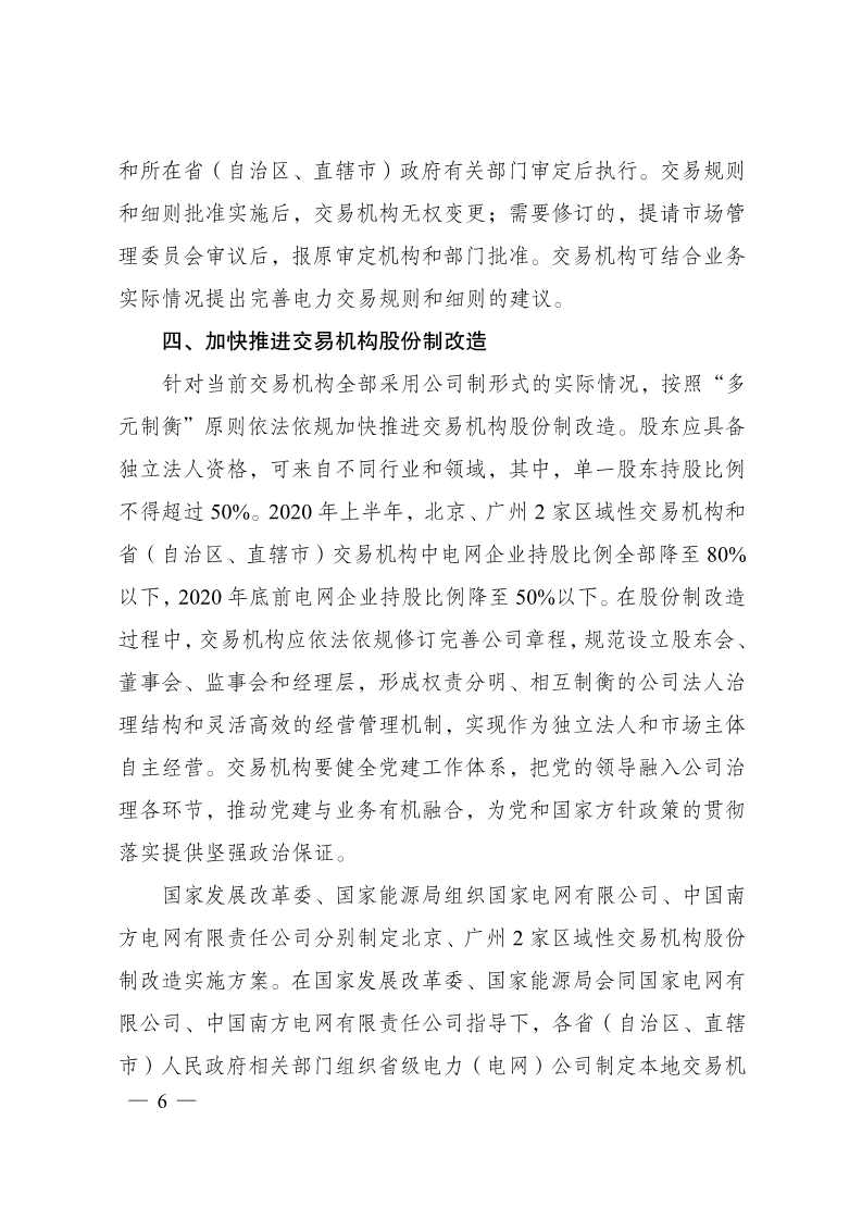 北极星电力网获悉,日前国家发展改革委 国家能源局联合印发《关于推进电力交易机构独立规范运行的实施意见》的通知,针对当前交易机构全部采用公司制形式的实际情况,按照“多元制衡”原则依法依规加快推进交易机构股份制改造。股东应具备独立法人资格,可来自不同行业和领域,其中,单一股东持股比例不得超过50%。2020 年上半年,北京、广州2 家区域性交易机构和省(自治区、直辖市)交易机构中电网企业持股比例全部降至80%以下,2020年底前电网企业持股比例降至50%以下。
