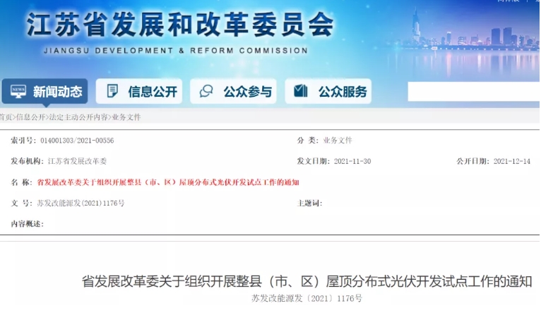 继浙江、河南、安徽三省之后,江苏省发改委发布《关于组织开展整县(市、区)屋顶分布式光伏开发试点工作的通知》的明确了不得以开展试点为由暂停、暂缓现有项目立项备案、电网接入等工作。