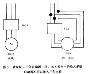 PS S系列中绝大部分启动器都可以与电动机的三角形电路连接,其结果就象一个星-三角启动器(图3),称之为“内三角”连接。这种连接可使软启动器的电流负荷降低,从而使电流控制范围扩大至515A,可以满足任何较小的应用设备,并能够为用户节约更多的空间和金钱。