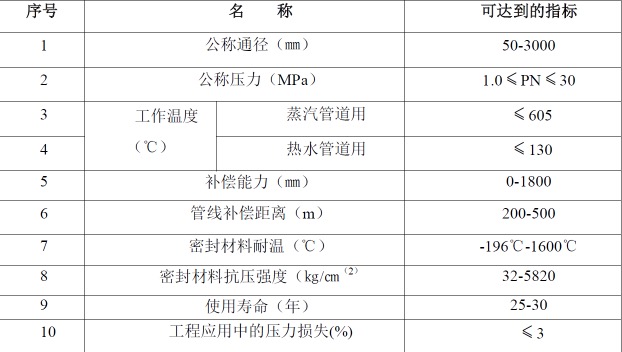 (2)独创环面与端面的自密封型式及新型端面密封材料,最高动态使用压力可达30MPa,可实现管道长距离两端补偿,即500米直管段内中间无需设置补偿器,可大大减少补偿器的使用数量;