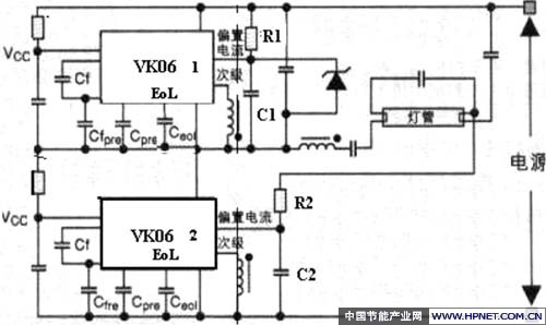 图2 应用VK06TL驱动电路的一个荧光灯镇流器专用的驱动器